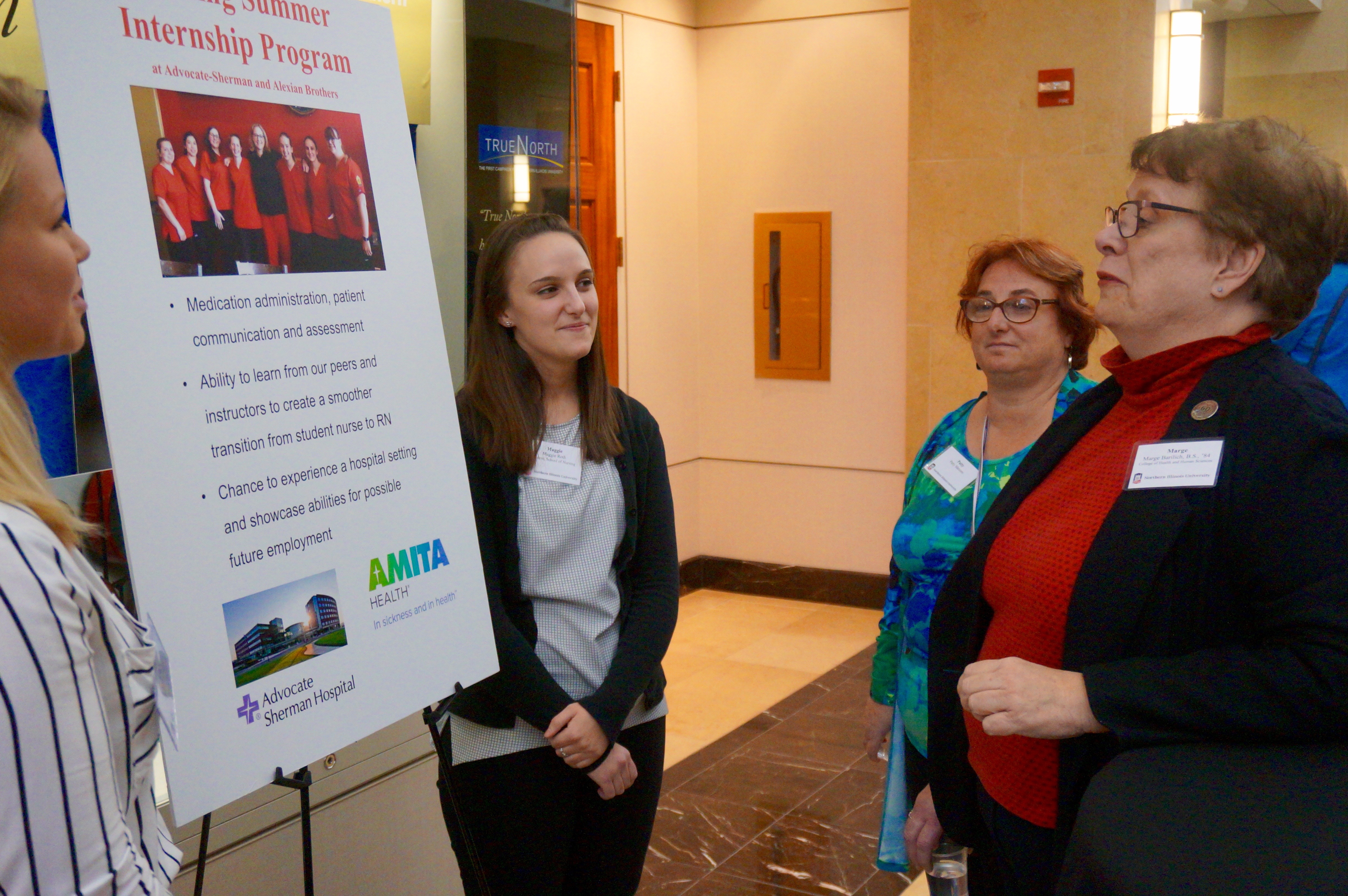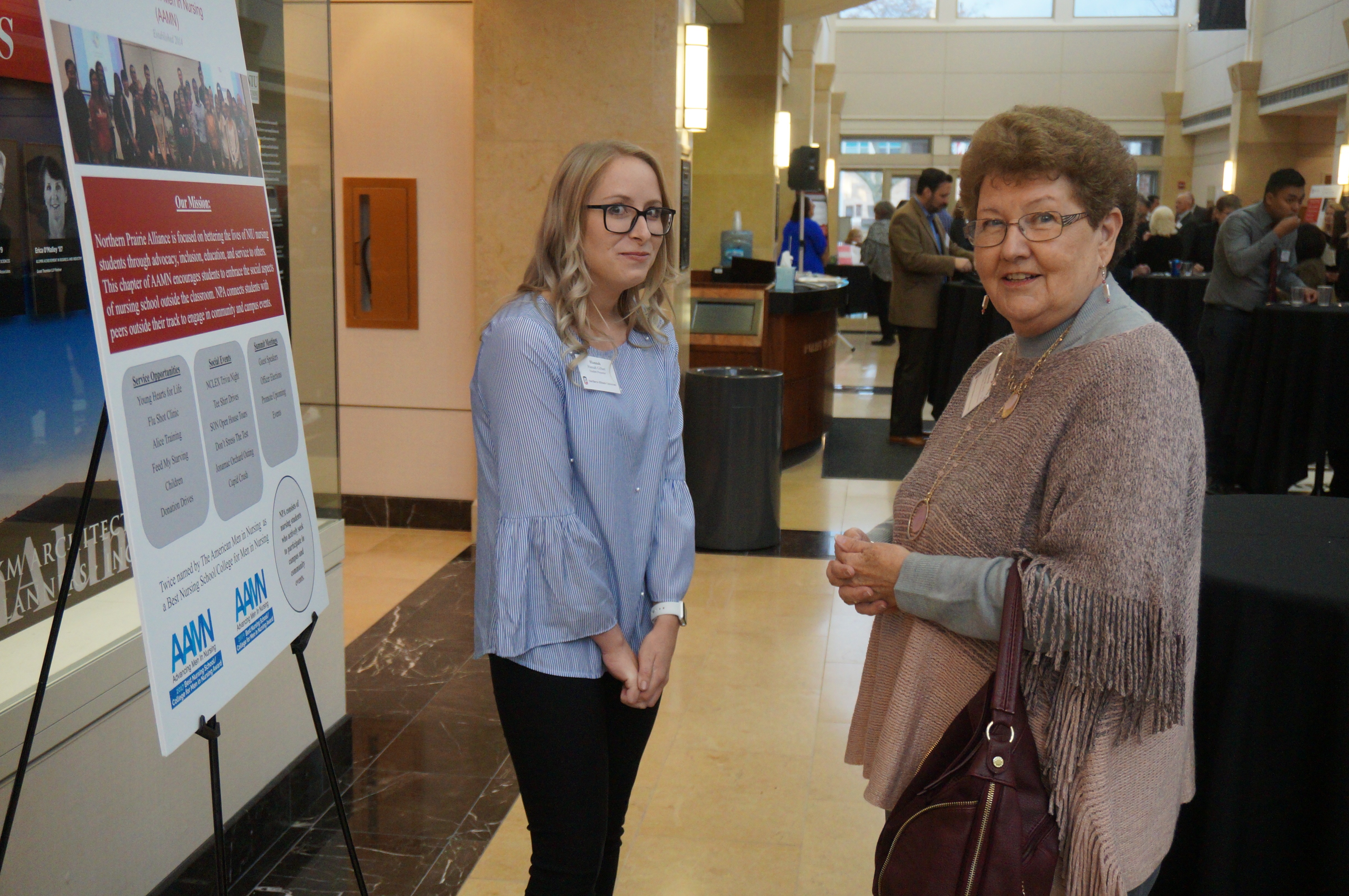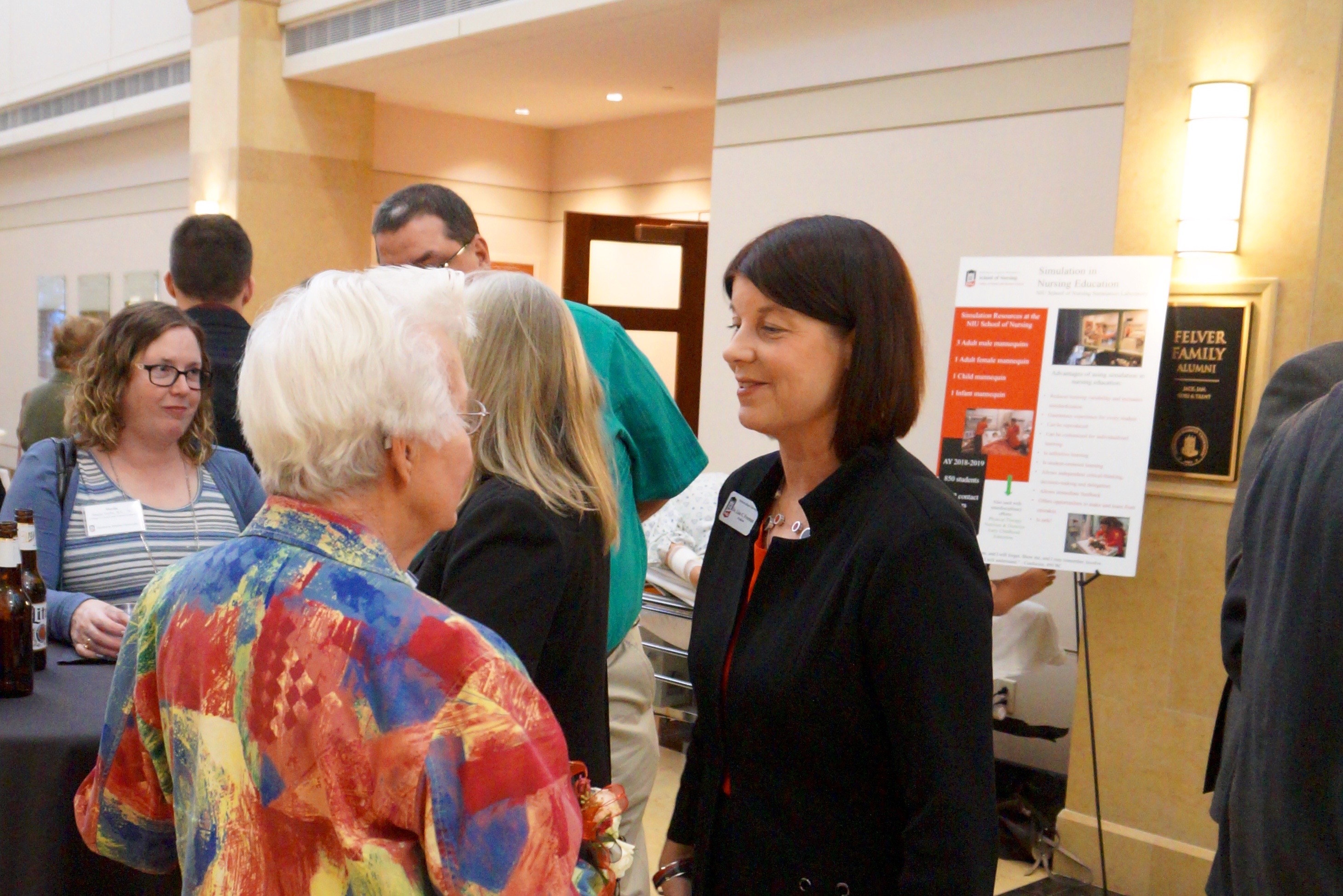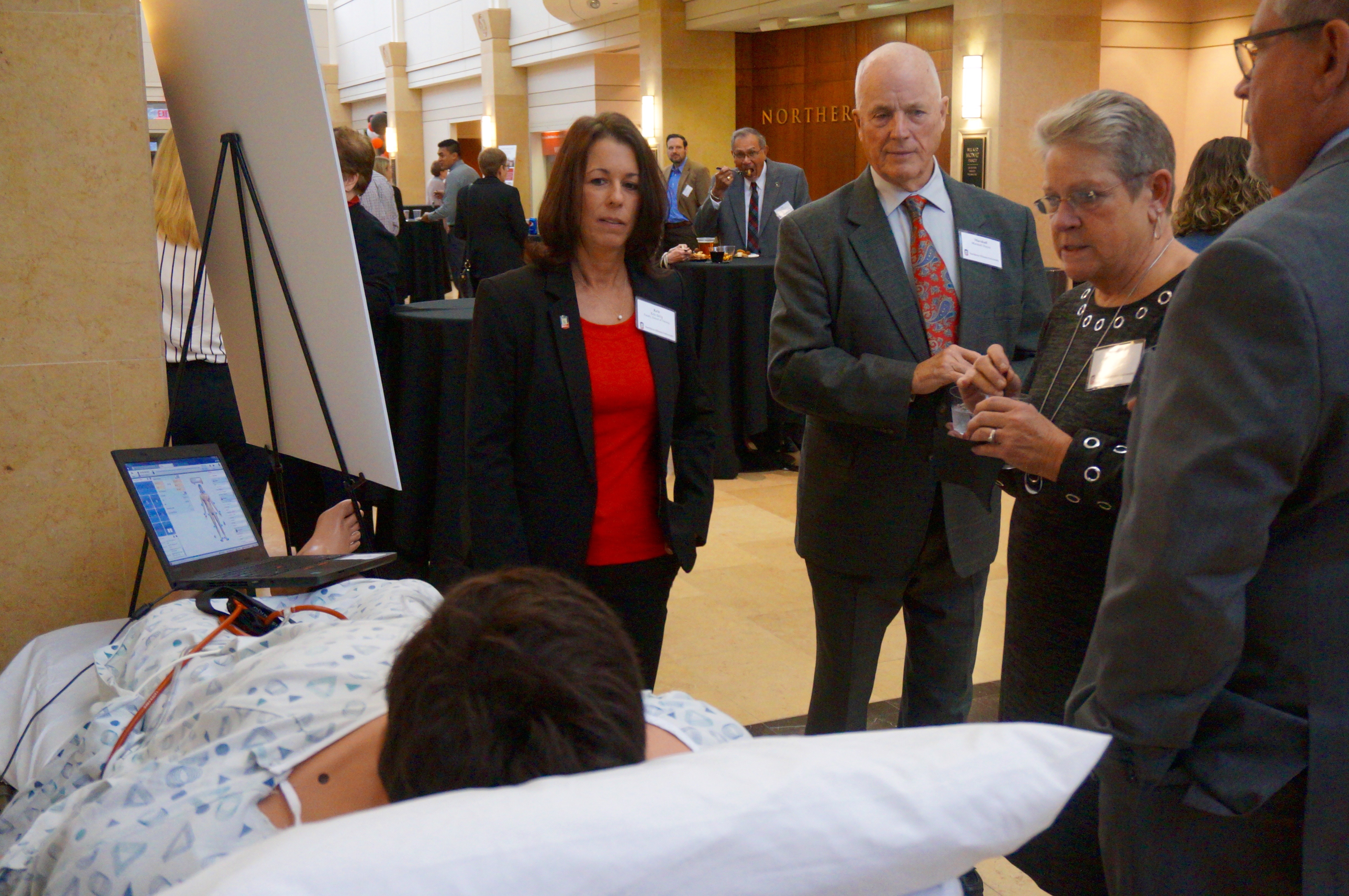 Over 100 nursing school alumni and friends gathered at the Barsema Visitors Center in DeKalb to celebrate. Alumni from five decades attended, as well as former and current nursing faculty. Current students presented posters about internships, study abroad, organizations, and research. Guests also enjoyed meeting CAE Apollo the adult patient simulator and seeing NIU nursing student uniforms throughout the years. Prior to the event, some guests toured the current School of Nursing.